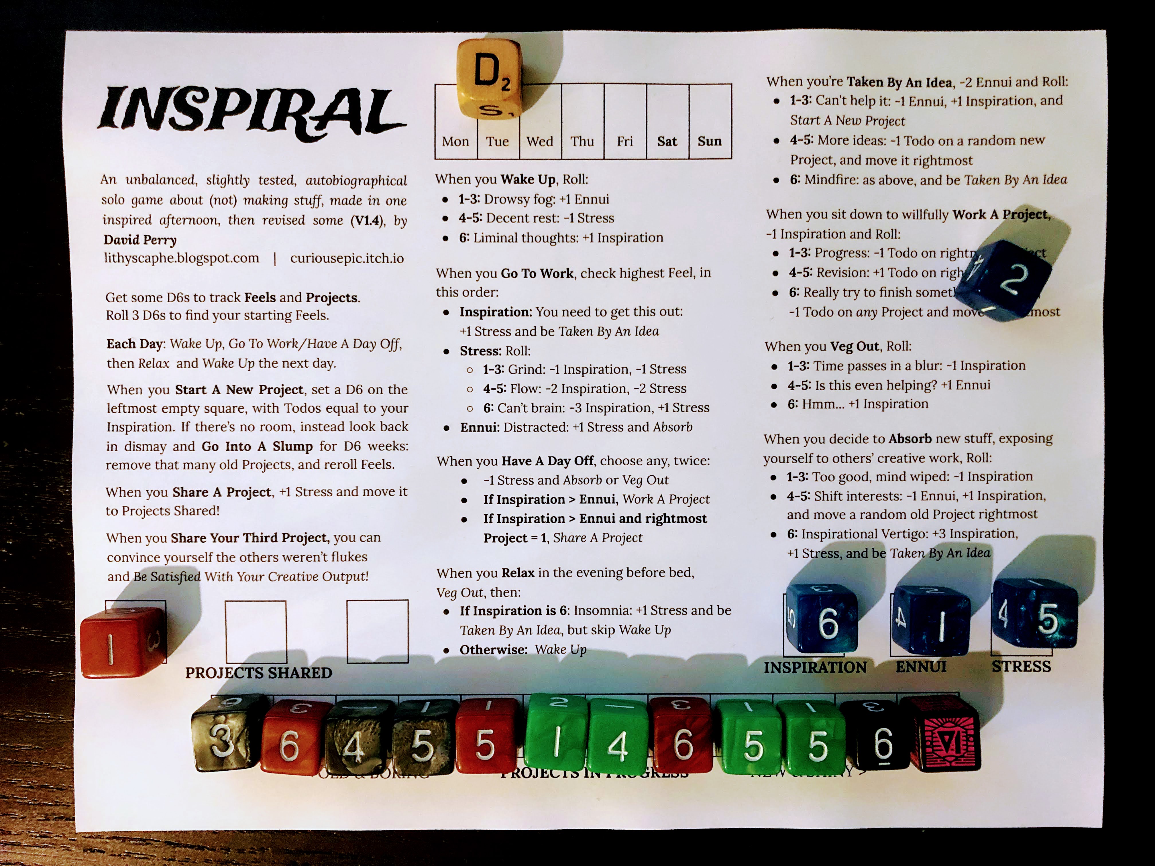 I've been feeling bad about not making (well, releasing) stuff, so today I made a game about (not) making stuff. It's unbalanced and untested, but I'm releasing it to remind myself that it's something I can do.